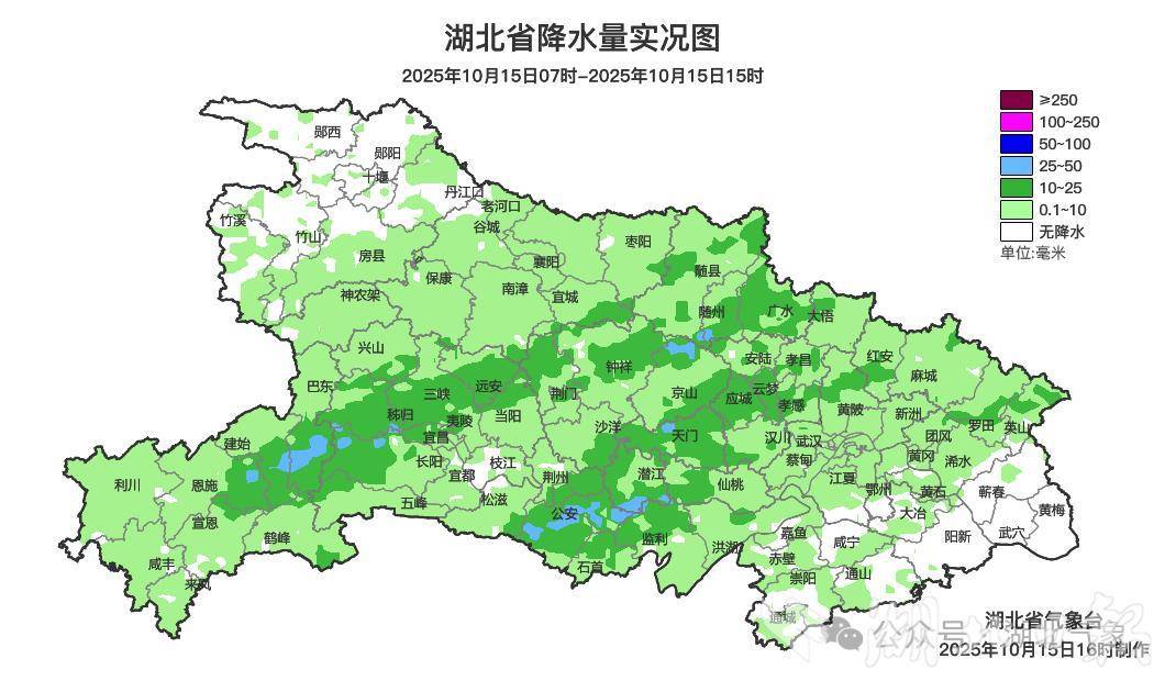 湖北日报讯(记者王京华)近日,我省大部地区持续遭遇“阴雨少晴”天气。 15日当天,全省仍阴云密布,大部地区出现降雨。其中,荆州、随州、恩施、黔江、天门、荆门、宜昌等地区30个乡镇出现强降雨。据气象资料最新分析,16日至18日,我省自西向东有中到大雨,湖北西部地区有大暴雨。 18日,我省最高气温降至17~21℃,最低气温11~16℃,局地降幅10℃以上。 2025年10月15日实时降雨图。10月15日20:00至10月16日08:00,鄂西南、江汉平原南部、鄂东南等地阴天有小雨,局地中雨或大雨;钍其他地方阴天有小雨。最低温度为16~20℃。偏北风2~3级,阵风4~5级。10月16日08:00至10月17日08:00,鄂西北、西南地区阴天有中到大雨,局地暴雨;阴天江汉平原、鄂东北西部地区有小到中雨,局地大雨;其他地方阴天有小雨。鄂东南地区最高气温22~25℃,其他地区18~22℃,最低气温16~21℃。偏北风2~3级,阵风4~5级。10月17日08:00至10月18日08:00,鄂西北、西南地区阴天有中到大雨,局地暴雨;阴天江汉平原、鄂东北西部地区有小到中雨,局地大雨;其他地区阴天有小雨r 地方。鄂西北地区最高气温17~20℃,鄂东地区26~29℃,其他地区20~26℃。最低气温14~19℃。偏北风3~4级,阵风5~8级。气象专家提醒,近期鄂西地区阴雨天气持续。公众需警惕持续降雨可能引发的次生灾害,尽量不要前往山区、水库等高风险地区。最近气温变化很大。公众应关注最新天气预报信息,及时增减衣物,谨防感冒。 上一篇:雨季和凉爽季节从16号开始。北京季节最新预报