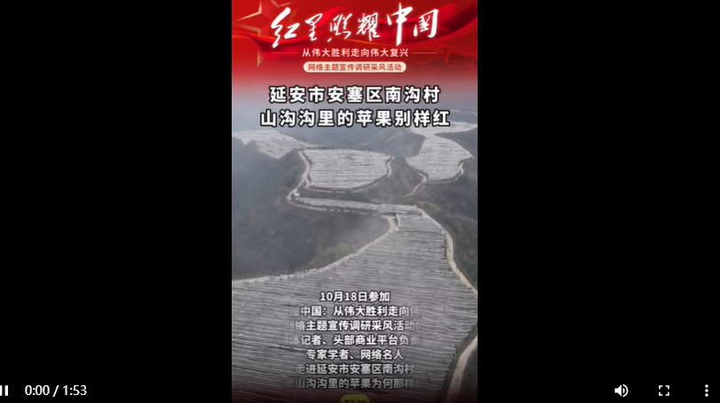 秋天的延安市安塞区南沟村,果园弯上的红果子挂满了枝头。谁曾想,曾经废弃的土地如今在矮苹果树的帮助下,结出了村民的“幸福果”,为乡村复兴开辟了一条伟大道路。 10月18日,参加“红星照耀中华:从伟大胜利走向伟大复兴”线上宣讲调研活动的媒体记者、头部电商平台负责人、专家学者、网络红人前往延安市安塞区南沟村,探秘沟里苹果变红的原因。