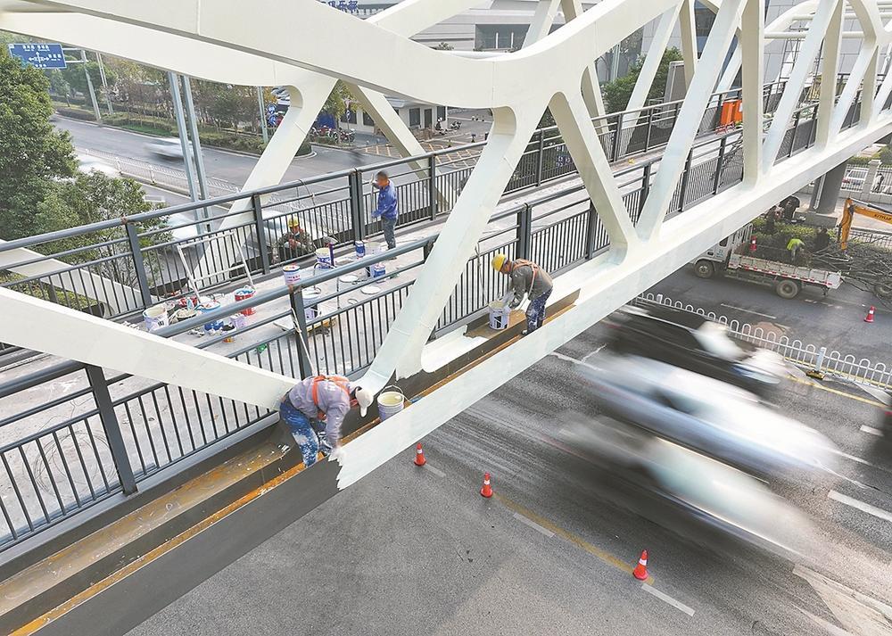 11月4日,工人们在襄阳市三十八中学人行天桥施工现场进行收尾工作。立交桥毗邻38中、航天泉...